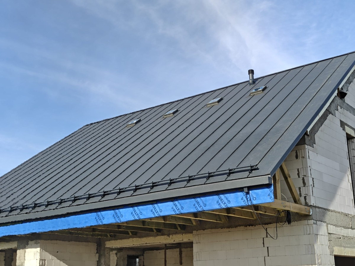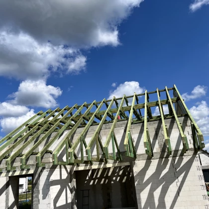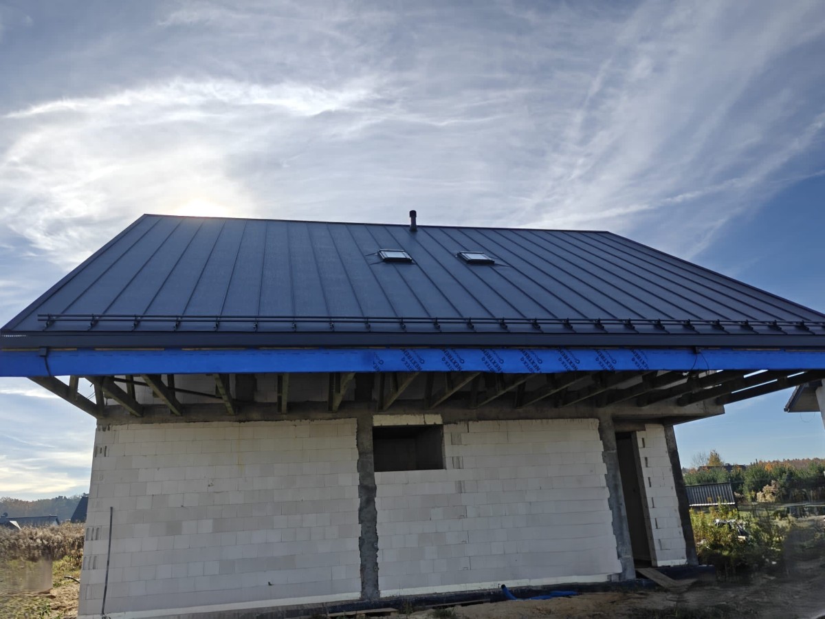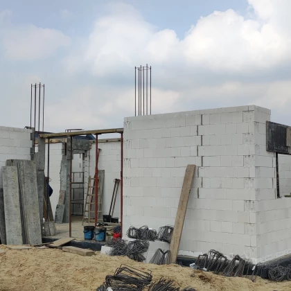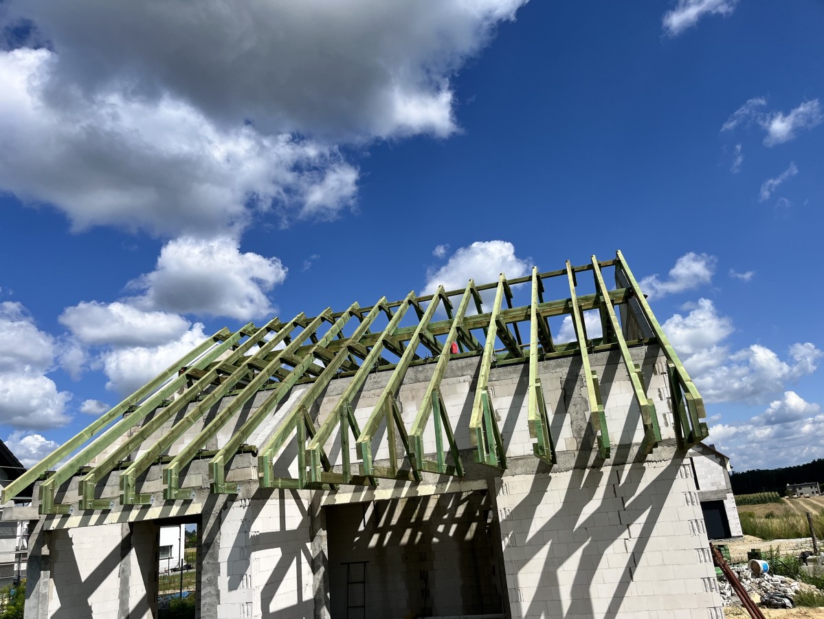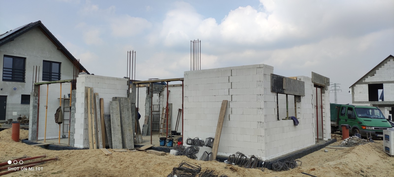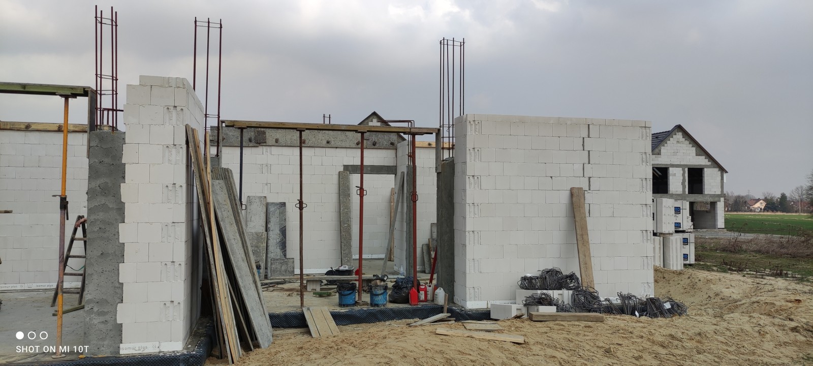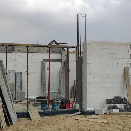 Budowa od podstaw domu jednorodzinnego parterowego z poddaszem użytkowym. Budynek posadowiony na płycie fundamentowej. Murowany z bloczków silikatowych na zaprawie cienkowarstwowej. Konstrukcja dachu drewniana wykonana w technologii CNC. Pokrycie dachu blachą na rąbek.