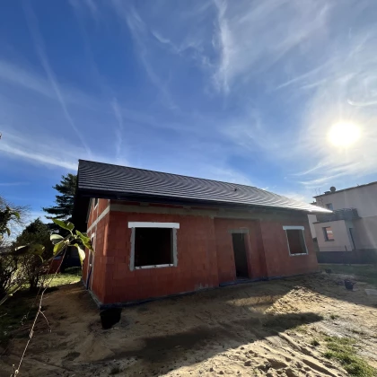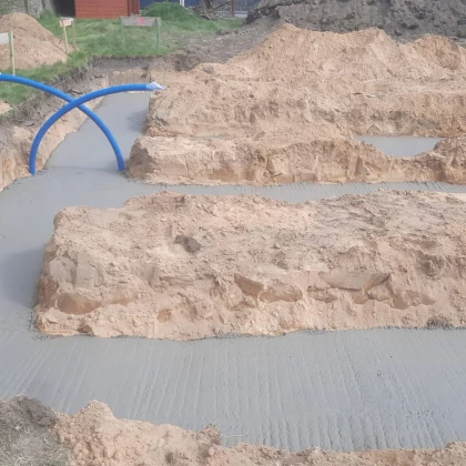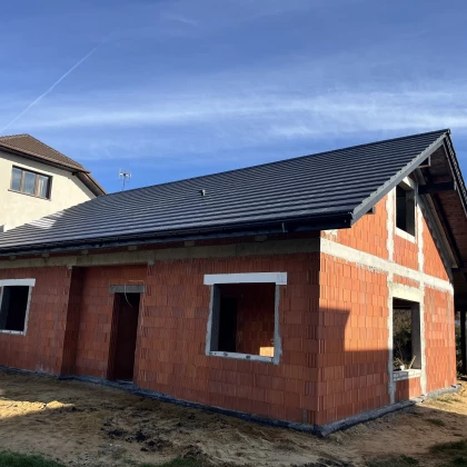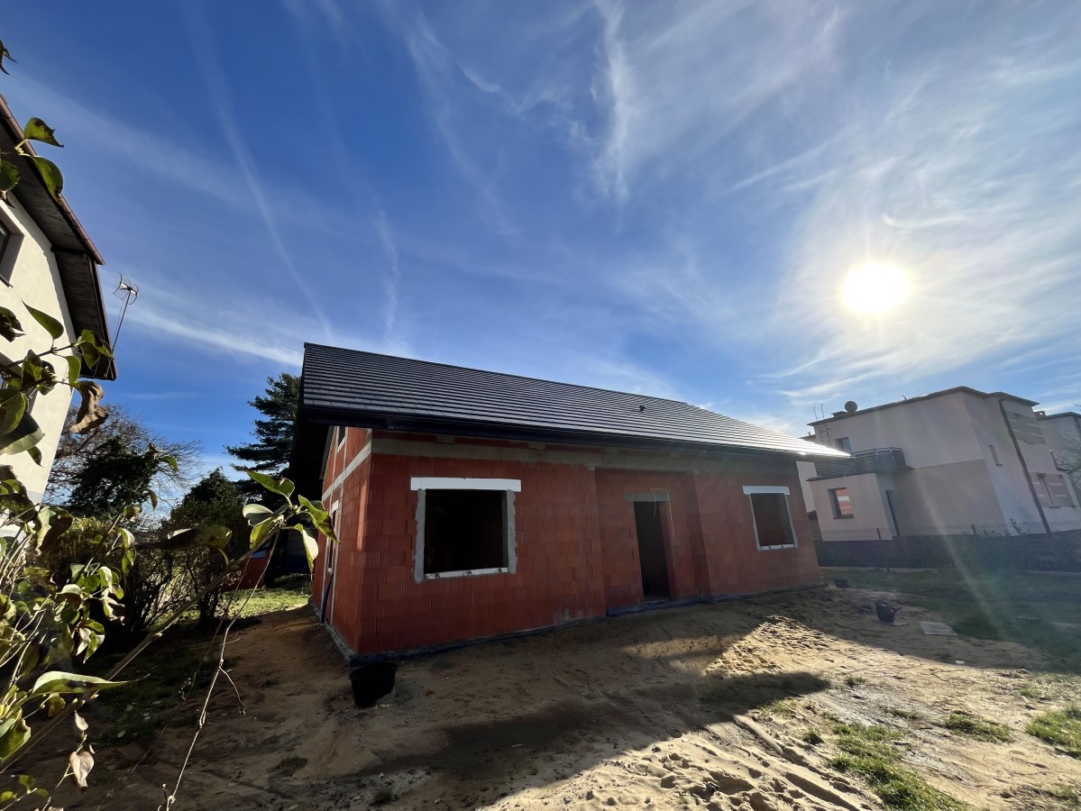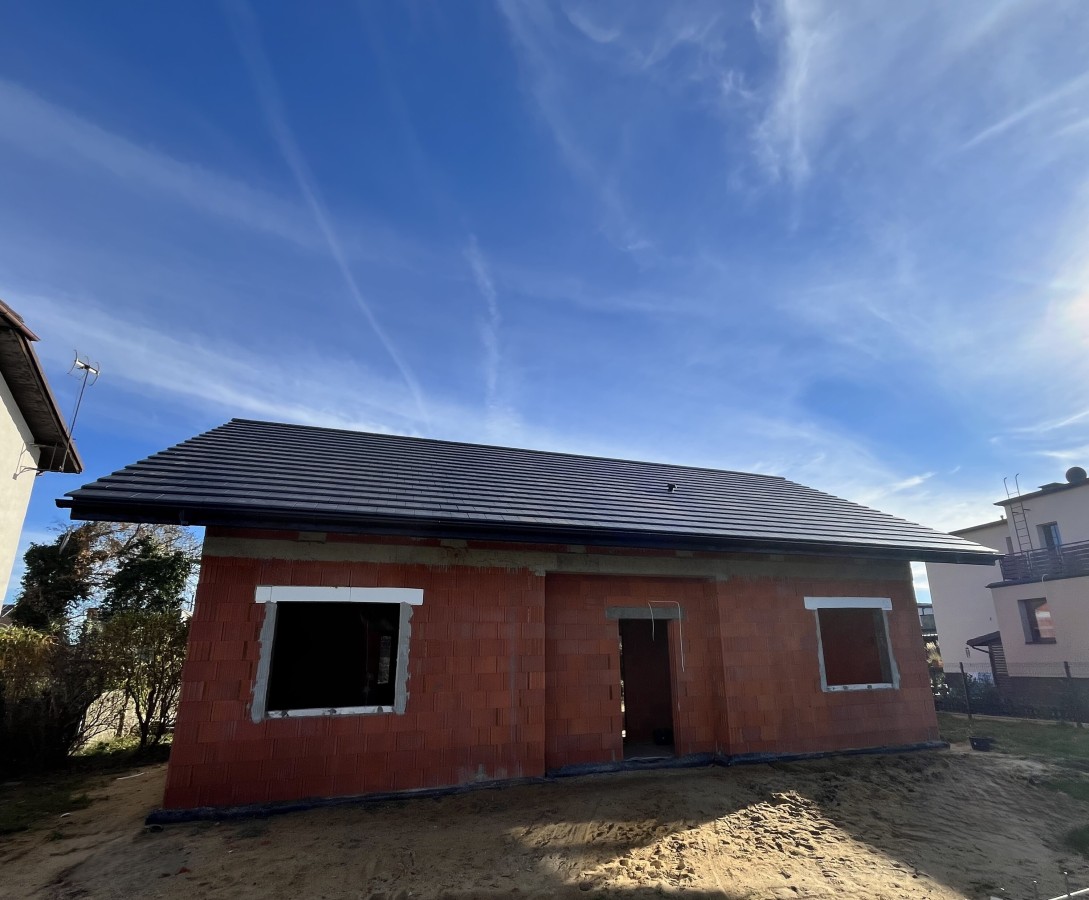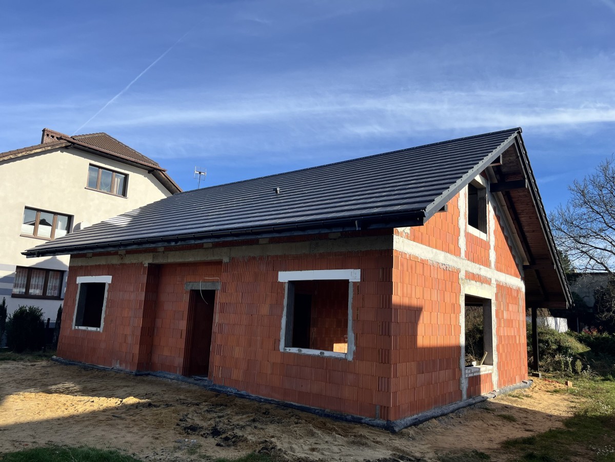 Budowa od podstaw domu jednorodzinnego w Rybniku. Budynek posadowiony na tradycyjnych ławach, parterowy z poddaszem nieużytkowym. Ściany fundamentowe wykonane z pustaków szalunkowych zalewanych betonem. Murowany z bloczków z ceramiki poryzowanej w technologii na pianokleju. Konstrukcja dachu drewniana wykonana w technologii CNC. Pokrycie dachu dachówką ceramiczną Elrus Linea.