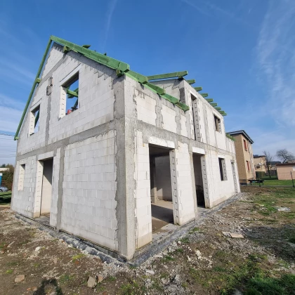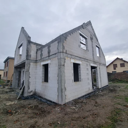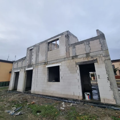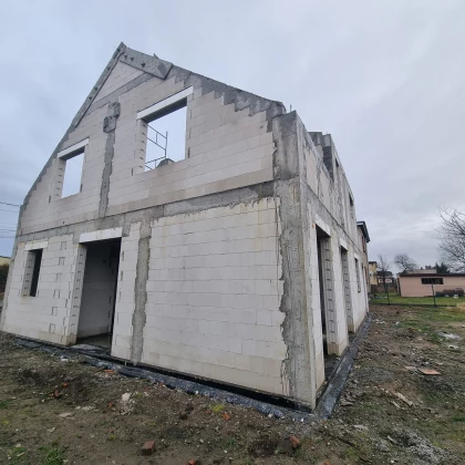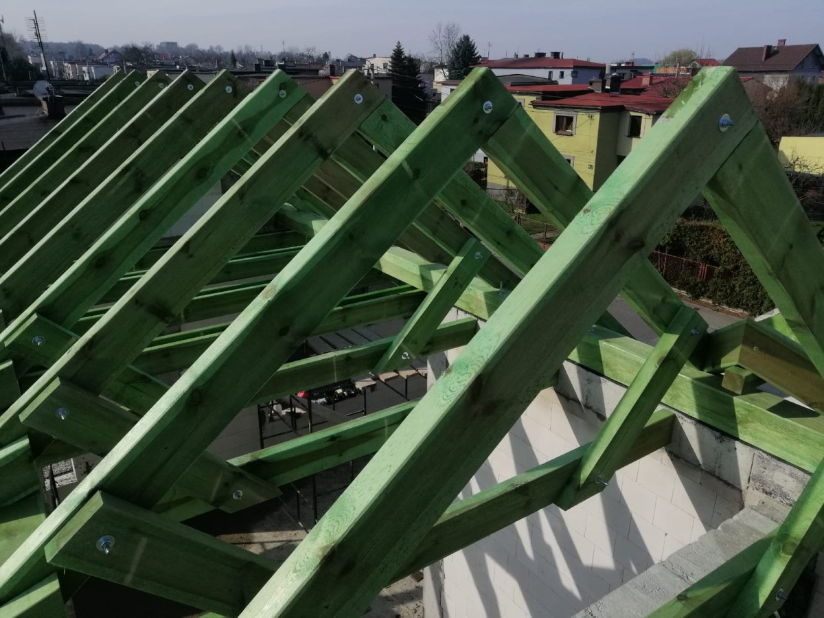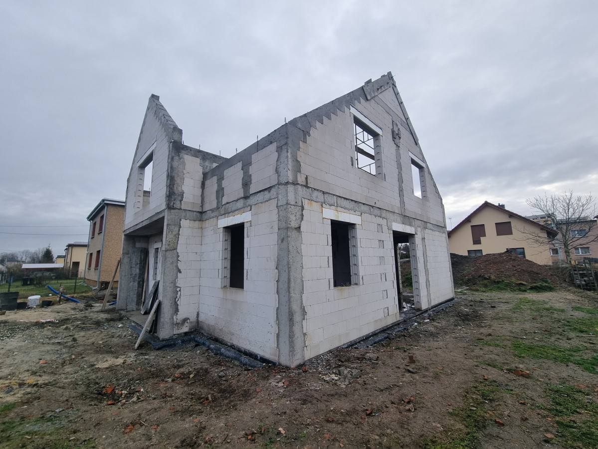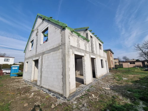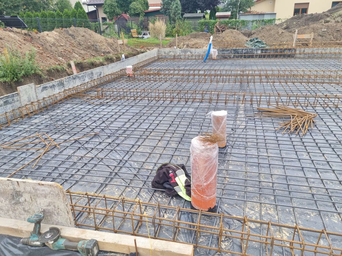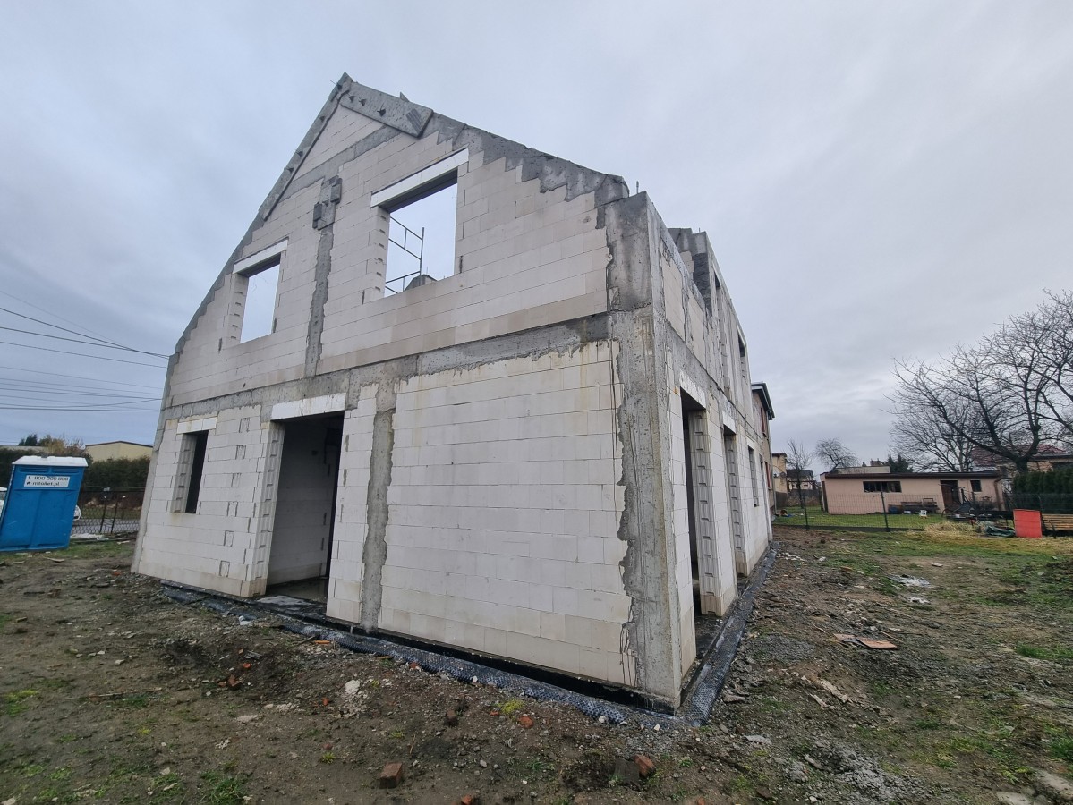 Budowa od podstaw domu jednorodzinnego piętrowego. Budynek posadowiony na płycie fundamentowej. Murowany z bloczków silikatowych na zaprawie cienkowarstwowej. Konstrukcja dachu drewniana wykonana w technologii CNC. Pokrycie dachu dachówką ceramiczną Elrus Linea.
