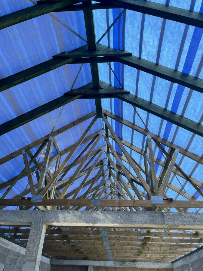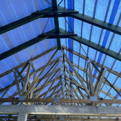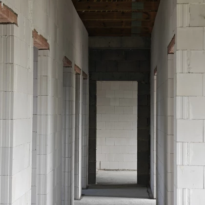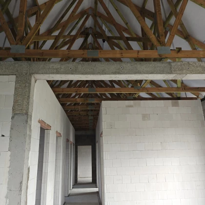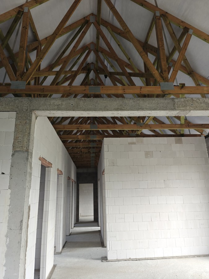 Budowa od podstaw domu jednorodzinnego w Żorach-Kleszczowie. Budynek posadowiony na tradycyjnych ławach fundamentowych, parterowy z poddaszem nieużytkowym. Ściany fundamentowe wykonane z pustaków szalunkowych zalewanych betonem. Murowany z bloczków keramzytowych. Konstrukcja dachu zaprojektowana i wykonana jako wiązary dachowe. Pokrycie dachu dachówką ceramiczną Elrus Linea.